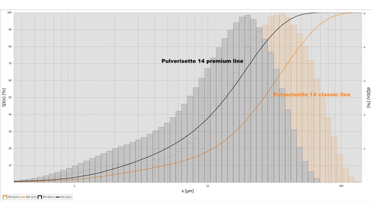 The above graph shows in comparison the particle size distribution after the comminution of the sample with the PULVERISETTE 14 classic line (20.000 rpm, 0.08 mm sieve ring with trapezoidal perforation, rotor with 24-ribs) and the PULVERISETTE 14 premium line (22.000 rpm, 0.08 mm sieve with ring trapezoidal perforation rotor with 24 ribs). In comparison, to the comminution with the PULVERISETTE 14 classic line the material is double as fine. The d50-value was halved from 26 µm down to 13 µm. The d90-value was also halved (63 µm to 33 µm).
