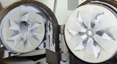 | Pictures: | Opened PULVERISETTE 13 chamber after grinding. Fine ground particles use to stick lightly to the housing, some sample remains on the fixed disk. It is still possible brushing off that sample and feeding a second time. |