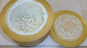Opened grinding bowl after a grinding time of 3 minutes. Sample is sticking to the bowl. |