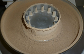 | Pictures: | Removed lid after a total of 70 seconds and 85 g of sample. The ribs of the impact rotor as well as the openings of the used 0,5 mm sieve ring are almost free of residues. A grinding of up to 500 g of sample should be possible with the accessories for grinding large quantities. |