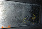 Fixed crushing jaw made of tempered steel. The polished line (where the pen uses to mark in the left of the picture) might be the area where intact tablets of the cast iron sample will get pressed together. On two positions, it appears that a small layer of tempered steel has been scratched down (marked with the yellow circle). |