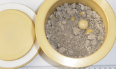 | Pictures: | Original sample material (130 g) inside the 500 ml bowl made of zirconium oxide with 25x 20 mm Ø grinding balls. |