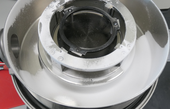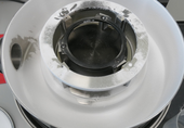 We prepared a batch of 45 grams of HDPE and fed the sample material extremely slow into the grinding chamber. We hope that the sample fragments will not remain attached to the sieve shells by the applied vacuum. We hope that the sample is spinning around inside the grinding chamber, until the sample was comminuted fine enough to pass the sieve shell perforations.
