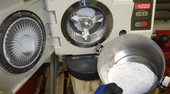 The grinding sound was typical. Only a tiny amount of fine sample dust escaped the filter house above the collecting vessel. For a desired amount of 25 kg, we would recommend using the optional 30 liter collecting vessel.
