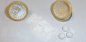 With just 30 seconds of grinding at maximum speed (50 Hz), the tablets were ground to a fine powder which started sticking to bowl and grinding balls. Also the bulk volume of the sample rose and filled the bottom half (together with grinding balls) almost completely.