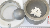 One bag of B1 tablets were used. The tablets were crushed after the first minute and no large fragments were found inside the sample. After a total grinding time of five minutes, majority was ground to a fine powder, but also few fragments were found with ~ 500 µm length were present.